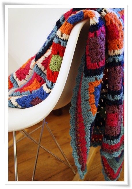 Tätä oli oikeastaan ihan mukava tehdä. Mukavampi kuin aiemmin tekemäni vastaava peitto joka oli täysin valkoinen. Tässä sai vähän leikkiä värien kanssa. Tosin erivärisiä lankakeriäkin oli sitten ympäri sohvaa kun väriä joutui vaihtamaan koko ajan.