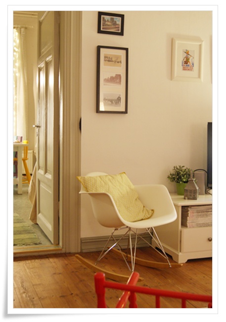 Nyt olohuone on ihanan tilava ja raikas! Varsinkin kun kuusen alta vietiin iso nojatuoli jo toiselle puolelle lastenhuoneeseen emmekä tuo sitä enää takaisin. Eamesin kiikku sai nojatuolin paikan. Pidän olohuoneesta nyt todella paljon! Päätin että aion jatkossakin kovasti yrittää etten täytä huoneita liikaa. Huoneiden korkeus, lattian kauneus ja kaikki tulee niin paljon paremmin esiin.