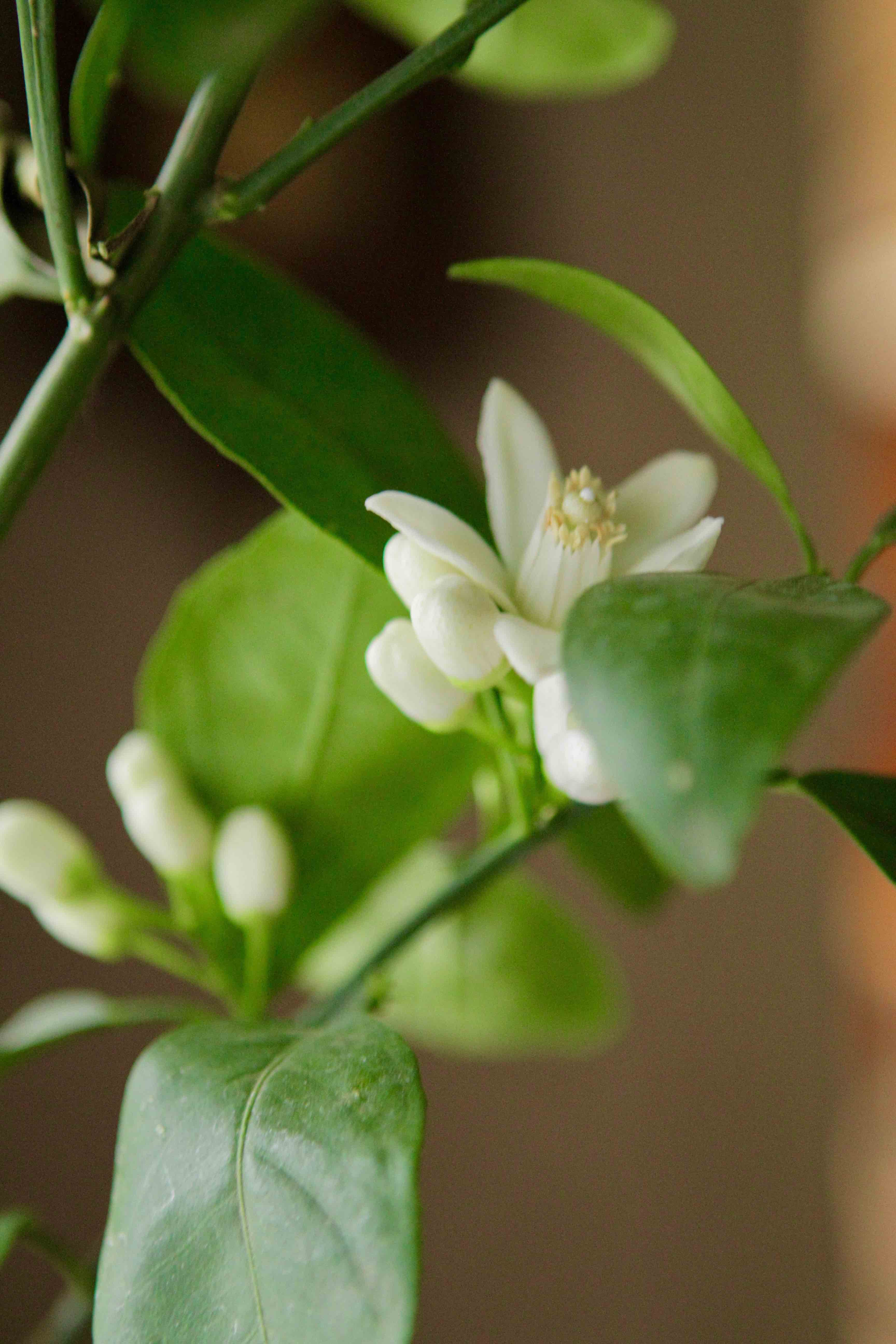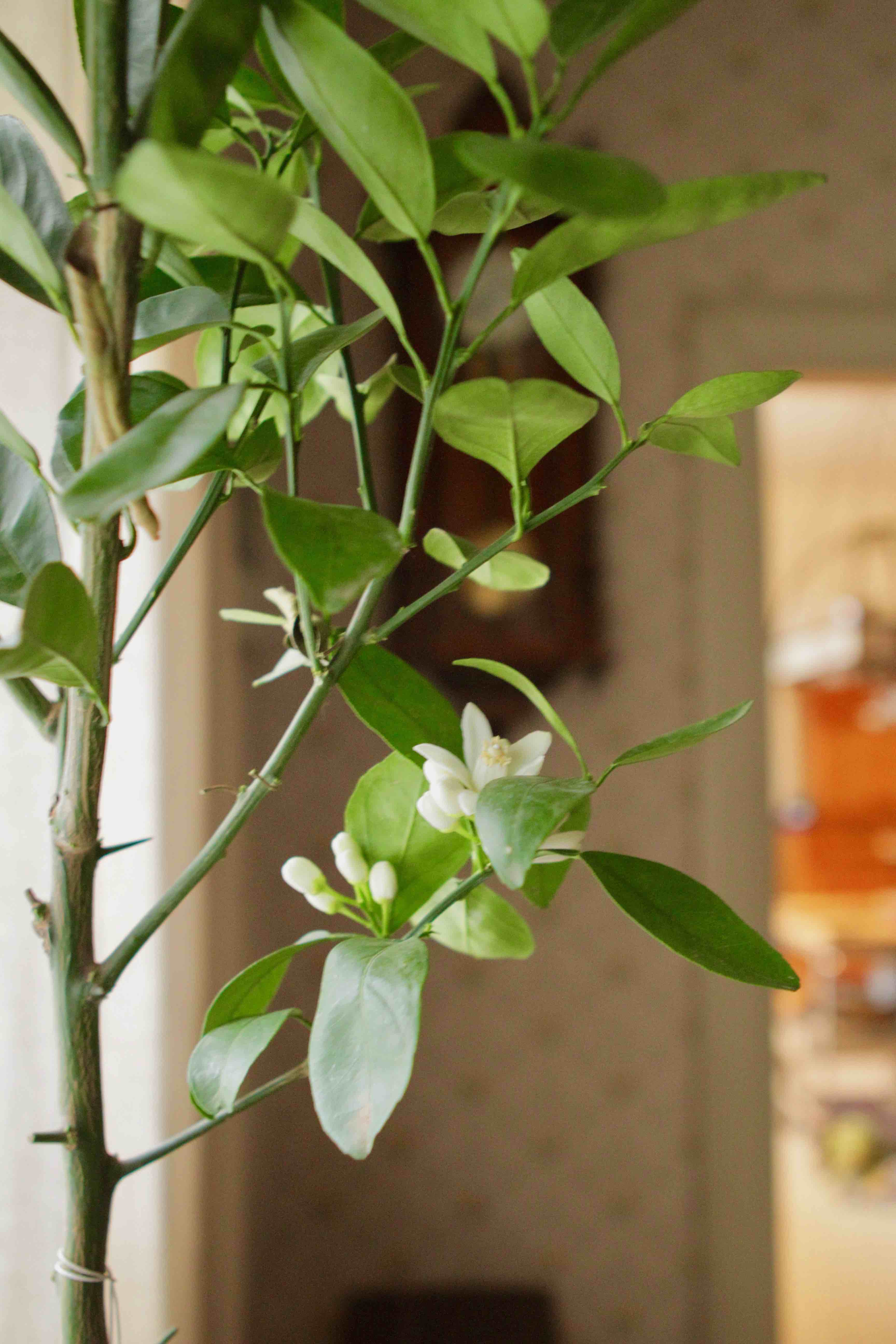 Kotona avasin paketin jännittyneenä. Puu oli ehjä, muovinen ruukku oli haljennut. Kävin ostamassa sille uuden saviruukun ja istutin sen siihen. Siitä lähtien puu on paistatellut salin ikkunalla ykköspaikalla ja saanut vettä ja vähän lannoitetta. Viime viikonloppuna kuljin puu ohitse ja ihmettelin mistä tulee noin hyvä tuoksu. Tuoksu tuli appelsiinipuusta, sillä se oli innostunut Suomen matkastaan niin että oli puhjennut täyteen valkoisia tuoksuvia kukannuppuja!