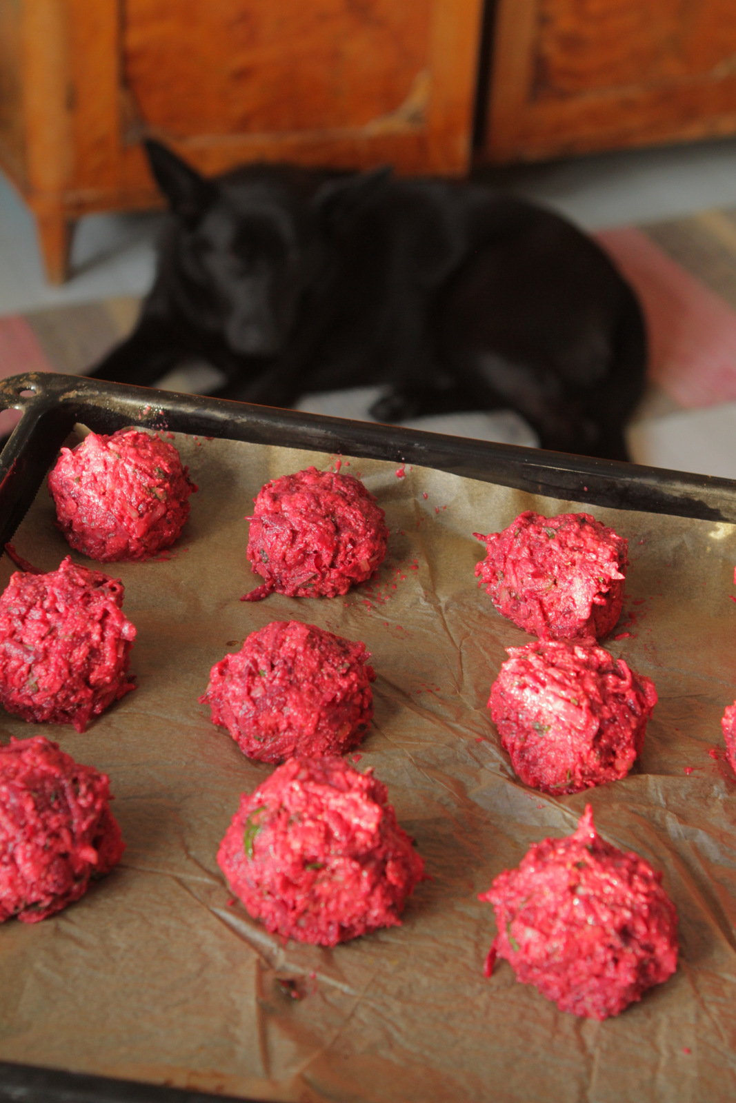 Kuori ja raasta punajuuret, hienonna sipuli. Sekoita kaikki aineet keskenään tasaiseksi massaksi ja muotoile niistä uunipellille 12 isoa pyyöreää pullaa. Paista pullat 200° /170° (kiertoilma) n. 30 minuuttia. Tarjoile heti, perunamuusin ja majoneesikastikkeen kanssa.