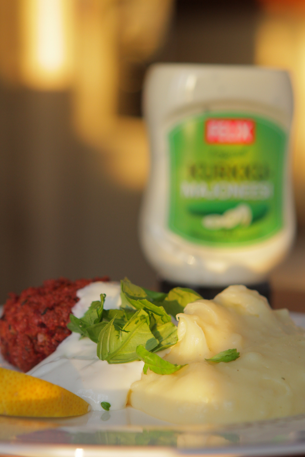 Tein pitkästä aikaa lasten toiveesta punajuuri-soijapullia ja perunamuusia ja tämä nyt on ainakin ehdottomasti sellainen ruoka mikä tarvitsee kylmän kastikkeen. Tämä uusi kokeiluni majoneesikastike toimi tässä ihan superhyvin, kastike oli myös entistäkin helpompi ja nopeampi valmistaa. Käytin siihen sekä kurkku- että aiolimajoneesia, mutta sama resepti toimii tietenkin muillakin Felix majoneeseilla, tuo sopivasti vaihtelua. Maustepähkäilykin jäi vähemmälle kun pelkkä suola ja pippuri riittivät. Ja mikä tärkeintä, se maistui: Lapset olivat ruoasta niin innoissaan, että tein seuraavana päivänä uudestaan tasan samaa ruokaa lisää. Niin käy tosi harvoin.