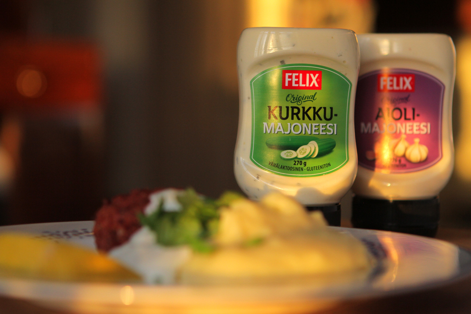 Felixiltä lähetettiin minulle paketti, missä oli neljää erilaista maustettua majoneesia. Kurkkumajoneesia, paprikamajoneesia, aiolimajoneesia ja ranskanperunakastiketta. Purkki oli kivan näköinen ja kätevä käyttää, koska seisoo kansipuoli alaspäin.