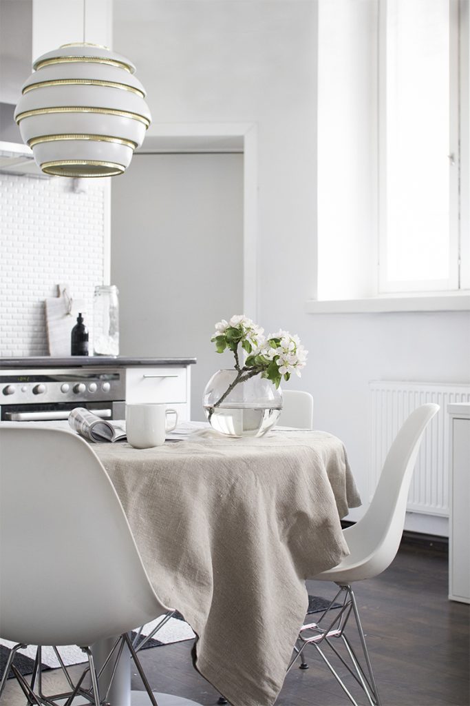 Kaunis tuo pellavainen pöytäliina ja omenapuunoksa maljakossa. Valoisa ja rauhallinen keittiö teillä.