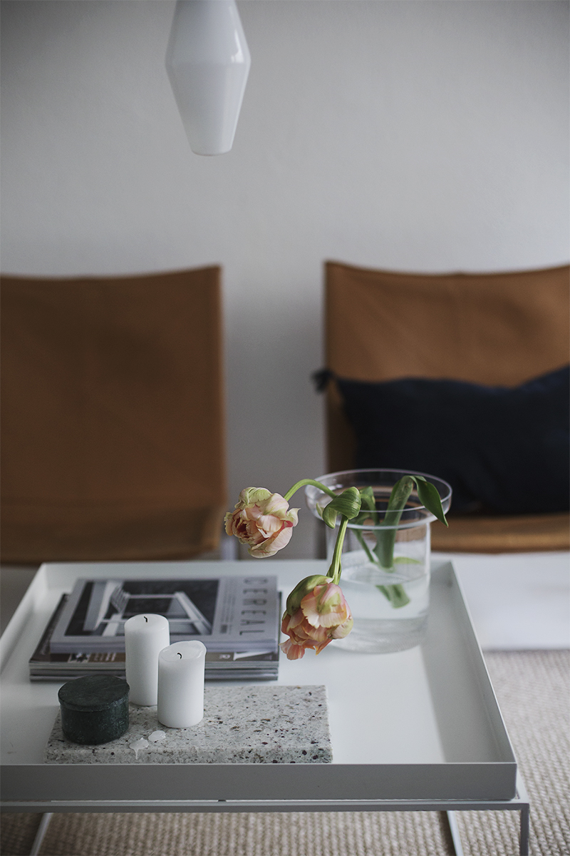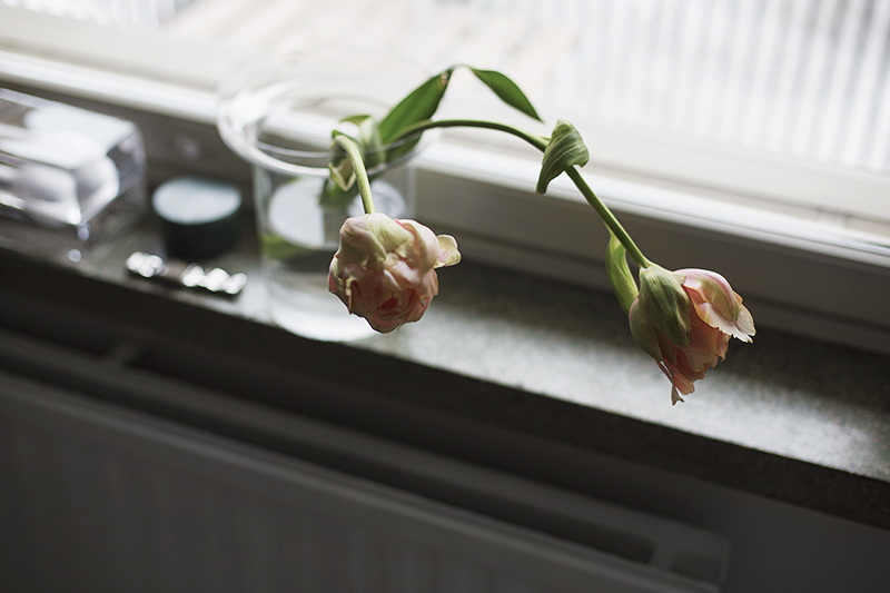 Ranskalaisissa tulppaaneissa viehättää vähän samat jutut kuin unikoissakin: paksuhko, rennosti kaartuva varsi ja iso pallomainen kukinto. Oranssihtava väri sopii aika mainiosti olohuoneeseen, konjakkia, ruosteenpunertavaa ja terrakottaa on nyt kerääntynyt sinne useaankin yksityiskohtaan. Tälläiset pienet väripisteet ovat jotenkin niin energisoivia ja tuovat heti sellaista tiettyä raikasta fiilistä kotiin. Kyllä värit ovat vain pienissäkin määrissä niin ihania.