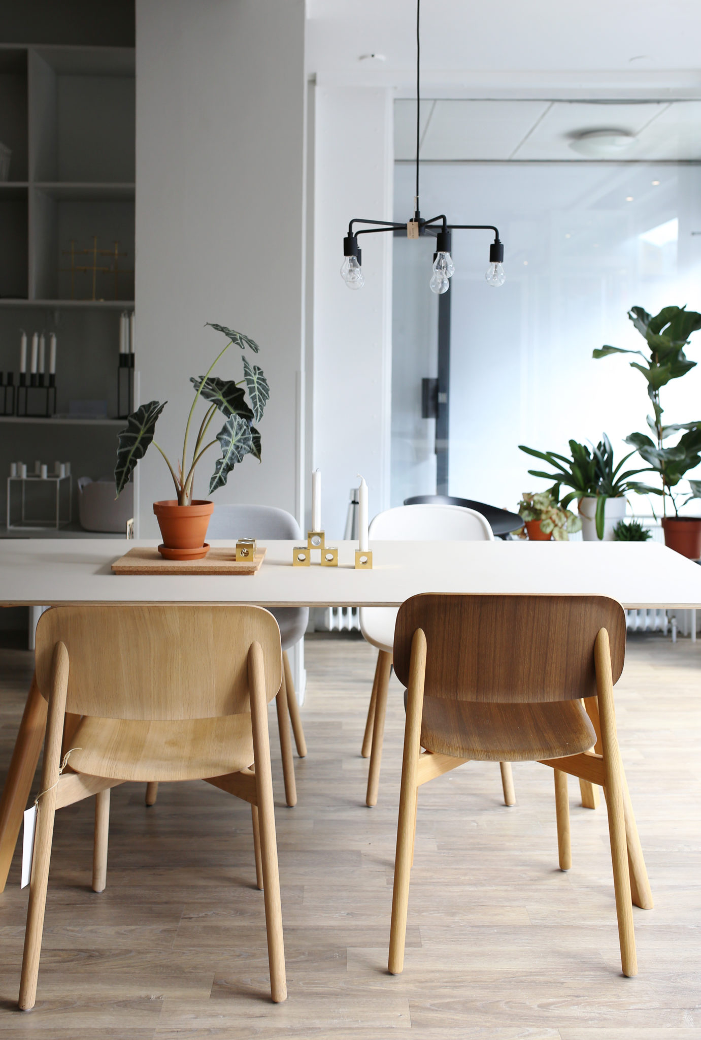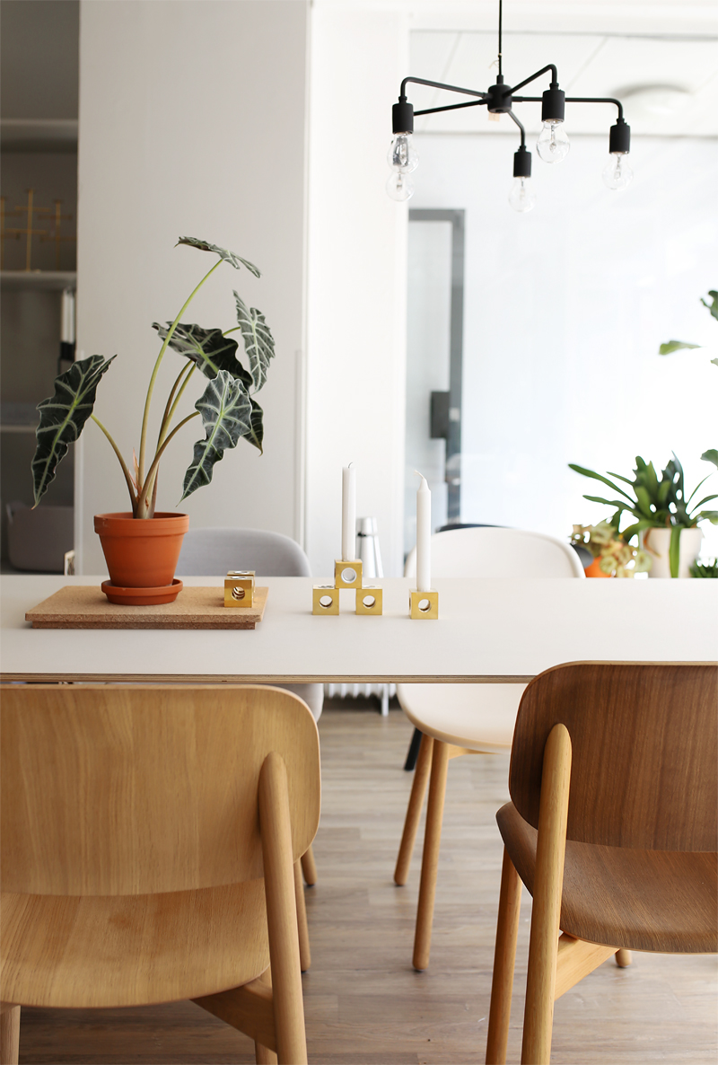 Viherkasvit toimivat ihanasti myös tässä kokonaisuudessa, joka näyttää minusta muutenkin aivan erityisen kivalle. Nuo Hayn Soft Edge -tuolit ovat minusta yksiä nykymuotoilun onnistuneimpia tuoleja; ne sopisivat loistavasti oman ruokapöytänikin pariksi, mutta harmi kyllä tarvetta uusille tuoleille ei juurikaan ole. Ruokaryhmän somisteena toimii enkelinsiipi ja lajitelma kultaisia kynttilänjalkoja – viherkasvit toimivatkin yhtä hyvin myös tällä tavalla pöydän päälle asetettuina.