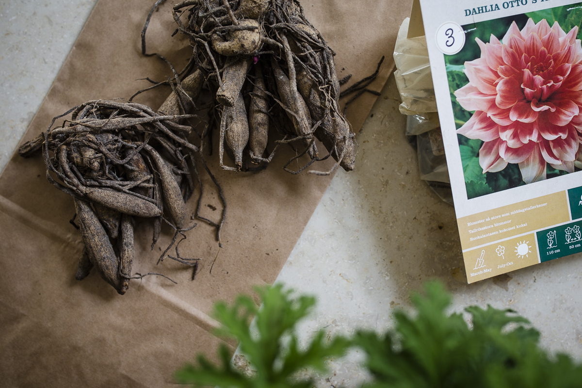 Vielä olen yrittänyt malttaa kesäkukka- ja istutushankinnoissa, sillä isommat mylläykset olisi tosiaan hyvä hoitaa pois alta ennen istutusten tekoa. Daalian mukuloita olen kuitenkin jo hankkinut, ajattelin kokeilla istuttaa ne suoraan maahan, katsotaan ehtivätkö kukkia ilman esikasvatusta. Myös unikon siemeniä kylvin jo pihan aurinkoisempaan kukkapenkkiin. Hankintalistalla on ainakin vielä tummakurjenpolvea valkoisessa Album-sävyssä, tämä sopisi ihanasti täydennykseksi puolivarjossa olevaan penkkiini, jossa kasvaa nykyisellään mm. kuunliljoja. Myös lumipalloheisin kaltaisia runsaita pensaita haluaisin liuskekivipatiota reunustamaan. Niin ihana nähdä, millaiseksi nämä kaikki sitten aikanaan kasvavat!